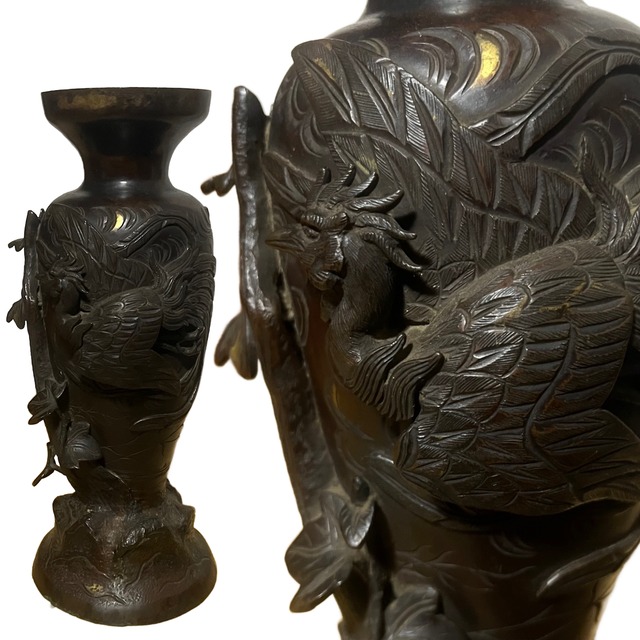 サイズ 高さ30.5cm×直径13cm 口直径9.5cm(口内直径8.5cm/中心口4.5cm) 明治期 刀剣の装身具(鍔や目貫等)が作られなくなった明治維新後頃。 それまで繊細な武具を製造していた職人は、こぞって日常品を作るほうへ舵を切るのですが、その頃、ヨーロッパで今で申しますと日本工芸品が非常に評価されておりました。 その頃に海外へ輸出品として作られた今でこそ美術品と称される品々を、当時の人は己の銘も打たずに切磋琢磨し制作に励みました。 現代でこそ、作家という概念が一般的になりましたが、その頃は一職人として個々人が持ち場の仕事をこなしておりました。 時代の波に翻弄されながらも地道に生き残る方向へ道を見出した方々の作品の中には、海外にウケの良いようにモチーフを春夏秋冬問わずに取り入れたものもございました。 例えば、藤の花の下に朝顔と鶴など。 日本古来より四季を重んじてきた作風も、この頃から徐々に変わっていきます。 ご覧の銅製花器は、いわば飾りの花入です。 実際に水を入れた様子が分かるのが底の裏部分に緑青がほんのりと浮かび上がっております。 できれば、このままアート作品としてご検討ください。 水漏れチェックはしておりませんが、水を入れるのはあまりお薦めできません。 「飾花器」として作られた作風と判断してのご案内です。 *緑青(ろくしょう)は、銅や真鍮が空気中の水分や二酸化炭素と反応して表面に生じる青緑色の錆(酸化被膜)です。鉄の赤サビとは異なり、緻密な保護膜となって内部の腐食を防ぐ役割を持ちます。かつては有毒と誤解されていましたが、現在では無害同等の安全な物質であることが証明されています。 細かな彫が施された鳳凰の羽や表情。 岩波のダイナミックな表現。 所々に点在する金彩の跡。 鳳凰を浮かび上がらせる事により、より一層迫力が増しております。 背景になにも置かず、一色の壁の前に置いてください。 照明や陽の光具合で凹凸が美しく映えます。 銅製の重厚感の中にも柔らかなフォルムが心地よい日本人の控えめな美意識と主張しすぎない雅な世界をご堪能いただけます。 18年ほど長期に渡り、某・・に貸し出しておりました。 (現在は貸し出しは行なっておりません。) バランスの取れたスリムな形状で30cm角の上に置いておかれたようですが、安定感があると仰っておりました。 新築祝いや店舗内を美術館のようにされたい方、いかがでしょうか? 銅製の為、重さがございます。 置かれる場所を予めお決めいただいた上でご検討ください。