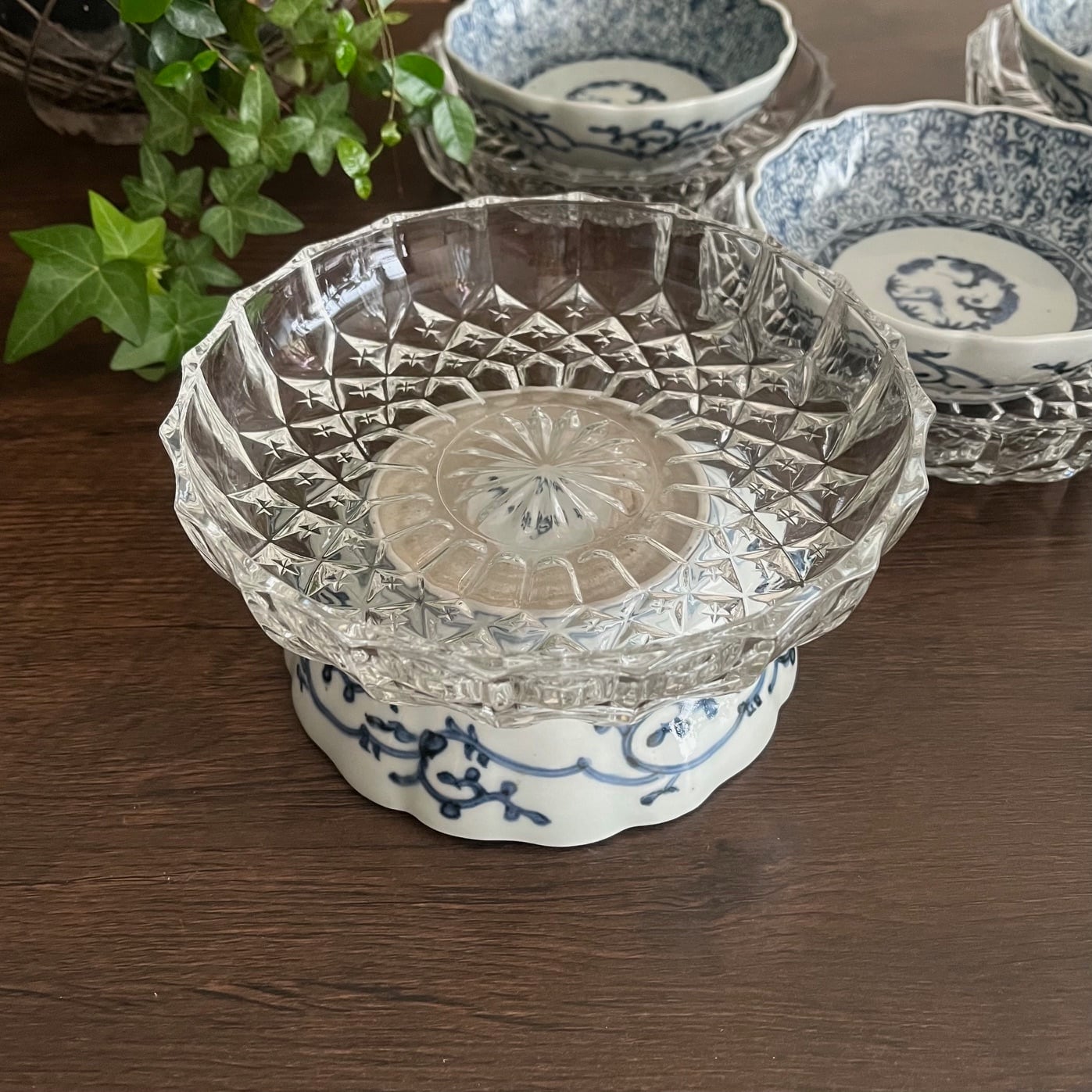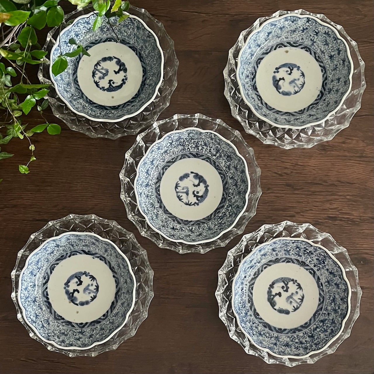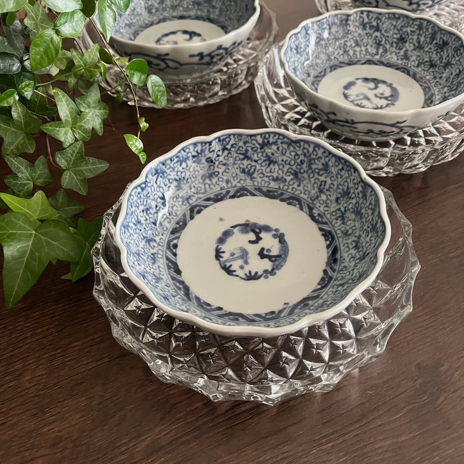<SET>伊万里染付微塵花唐草紋様成化年製なます皿5枚(1枚直し有)&<丸皿・小/プレート>透明カットガラス 昭和 アンティーク レトロ5枚