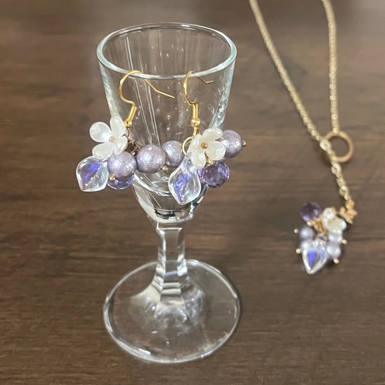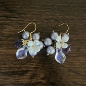 小さなパールも淡い紫で、1粒だけ透明感のあるカットガラスが添えられています。