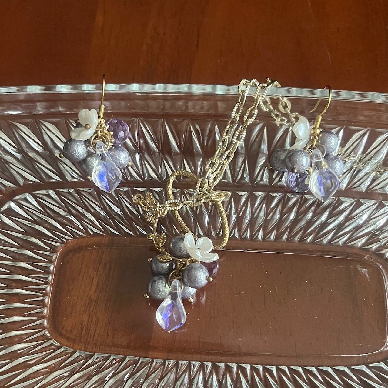 静かにきらめく藤色の雫と、可憐な白い花々を束ねたアクセサリーセットです。
