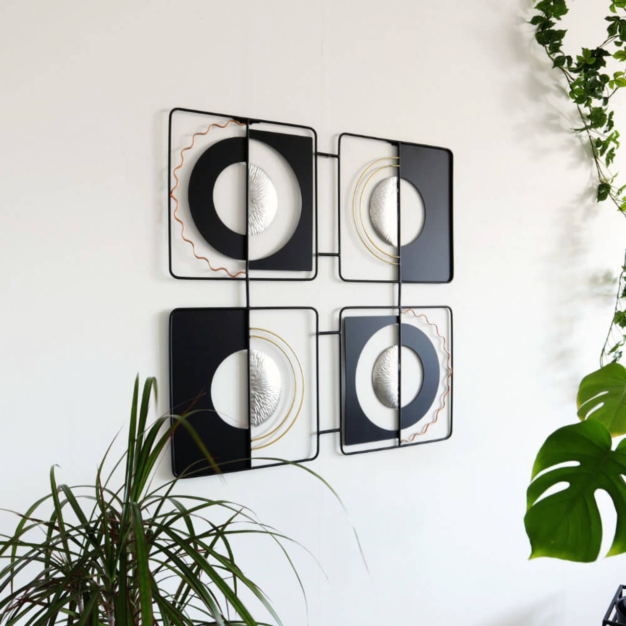 洗練されたブラック&シルバー アイアン製ウォールアート – モダンアートで空間を彩るアートピース