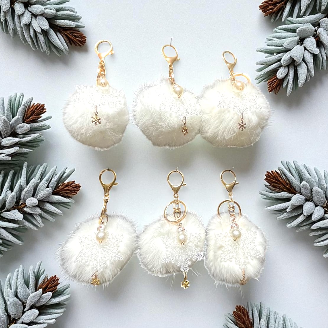 【数量限定】艶パール ラビットファー バッグチャーム 雪の結晶クリア&にこにこ雪だるまパールチャーム付