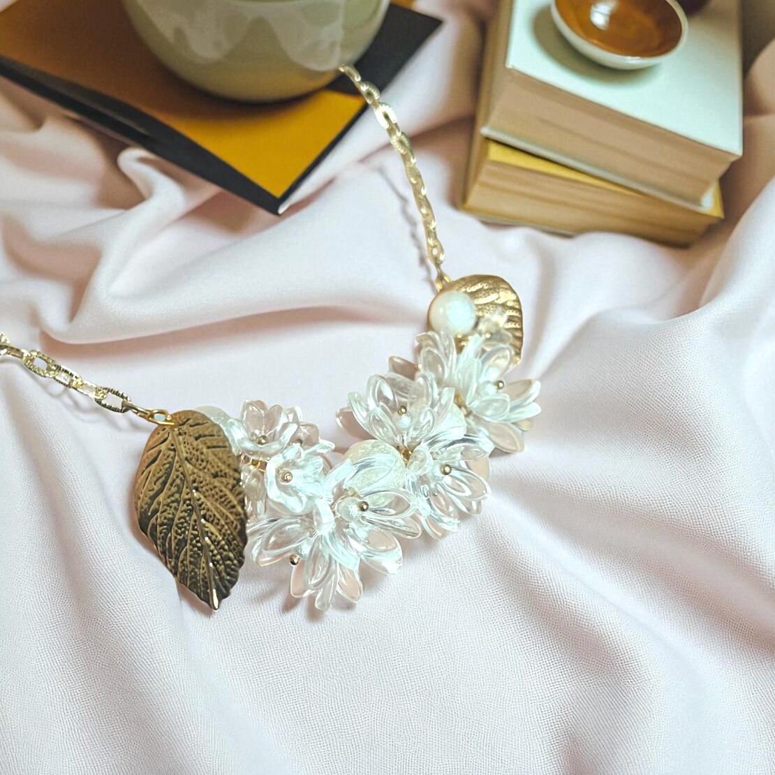 透明フラワーの間からコットンパールがのぞく、華やかで上品なネックレスです。