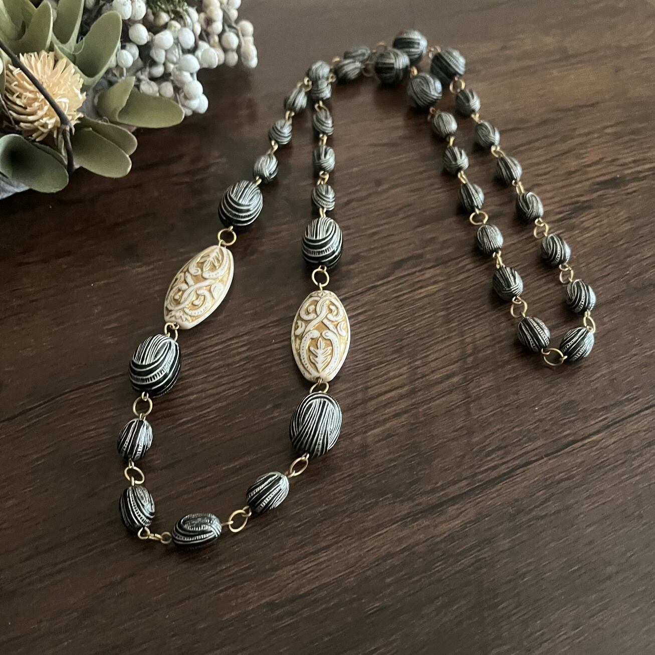 アンティーク調パーツを用いたお召し物に合わせやすいロングネックレスです。