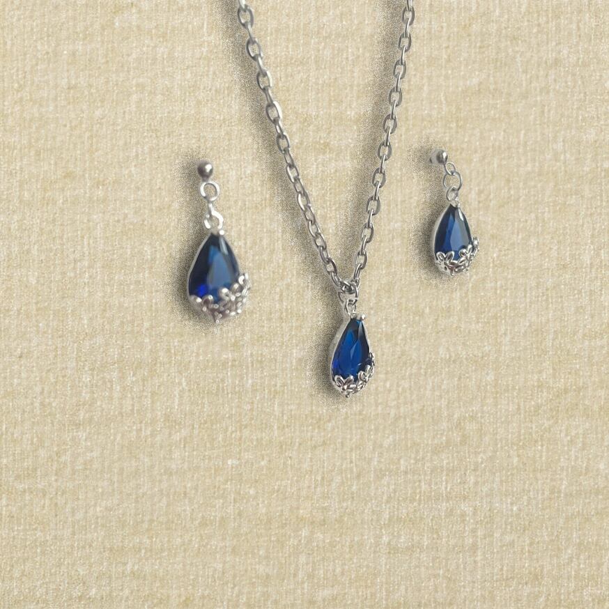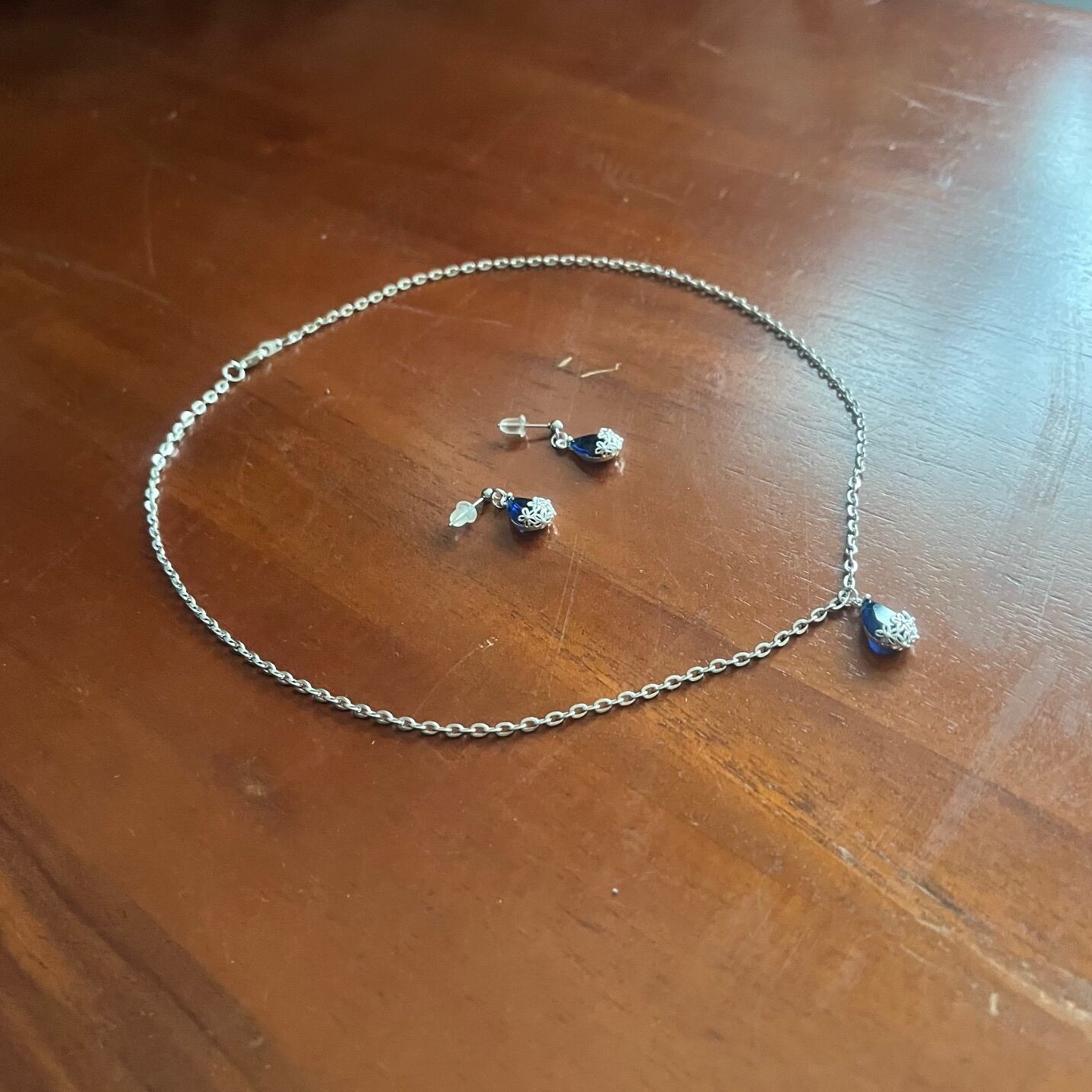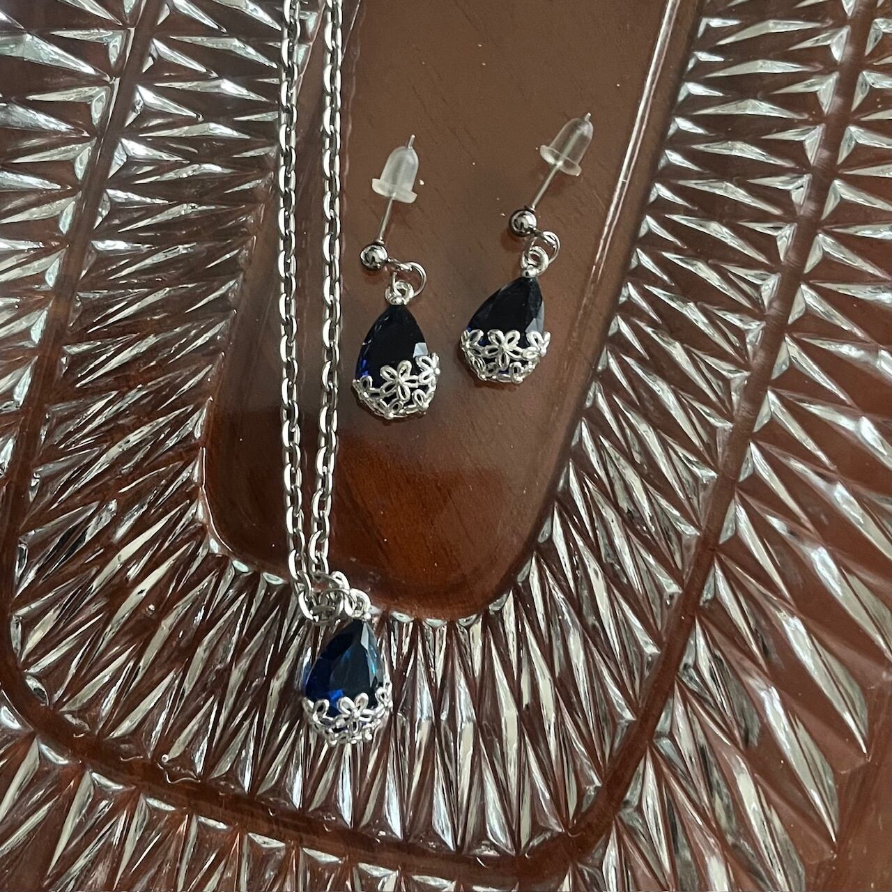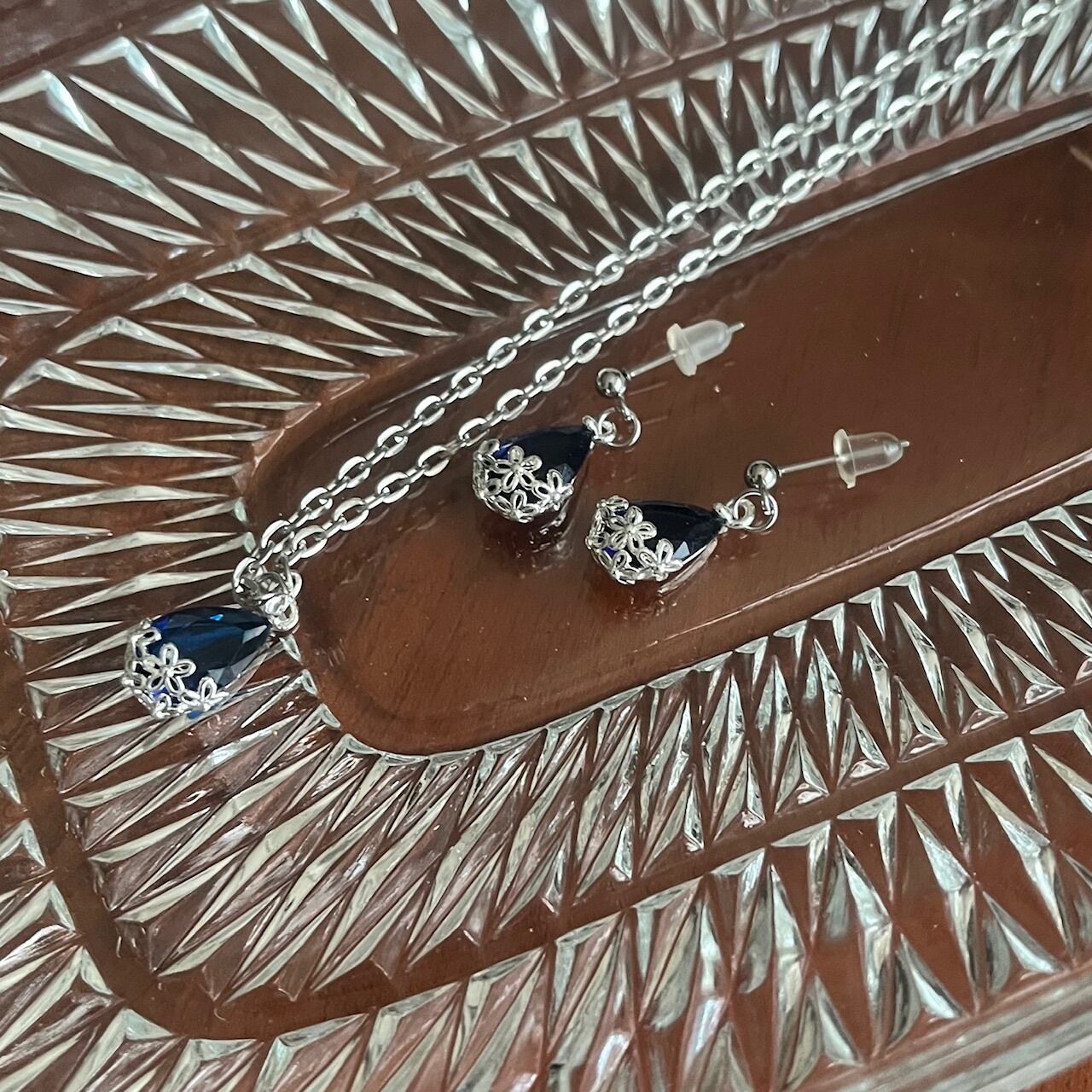 【錆びにくいサージカルステンレス製】ブルー雫カットガラス 小花 ネックレス&ピアス シルバー色セット