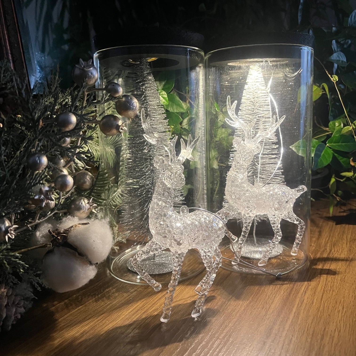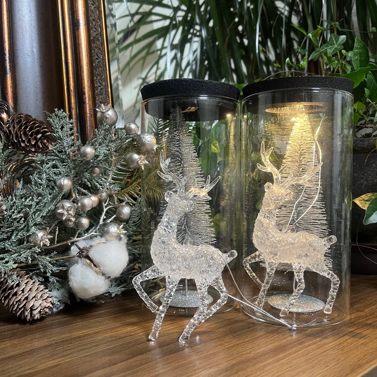 シルバーのツリーと透明なトナカイが佇む、冬の物語を閉じ込めたガラスドーム。