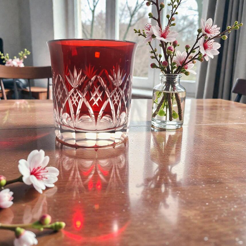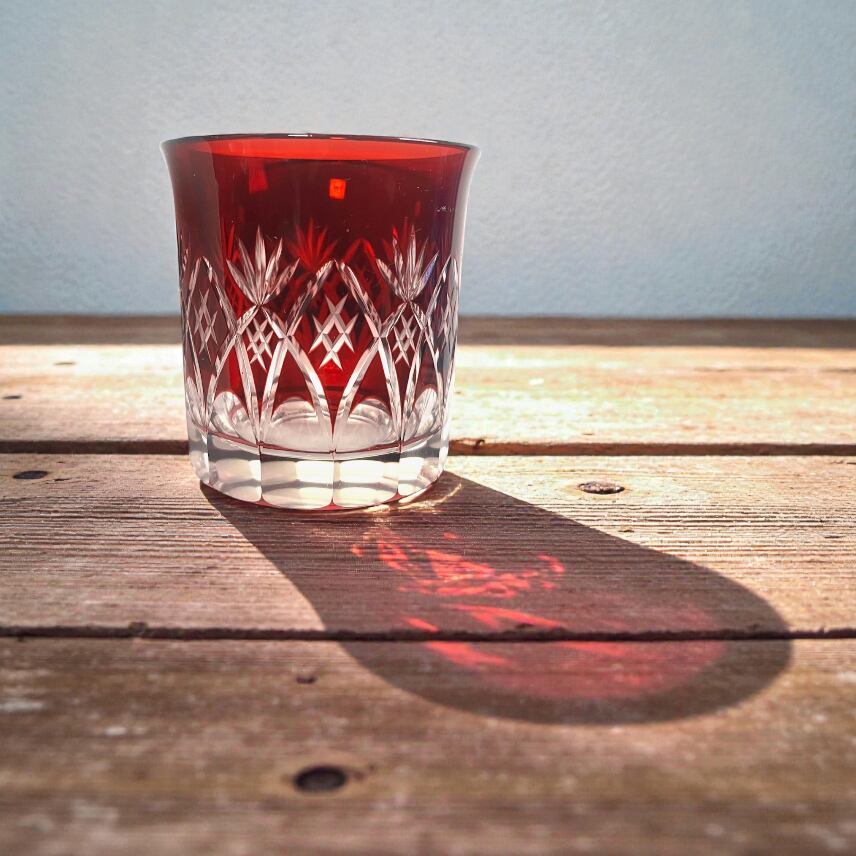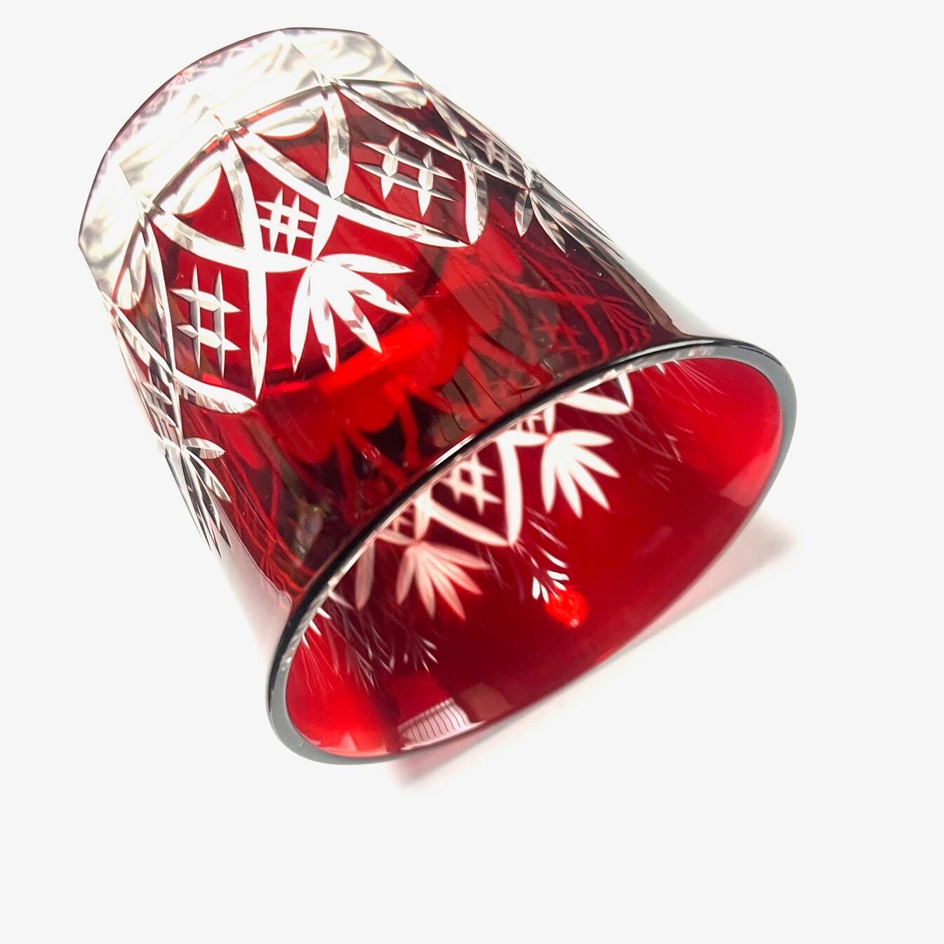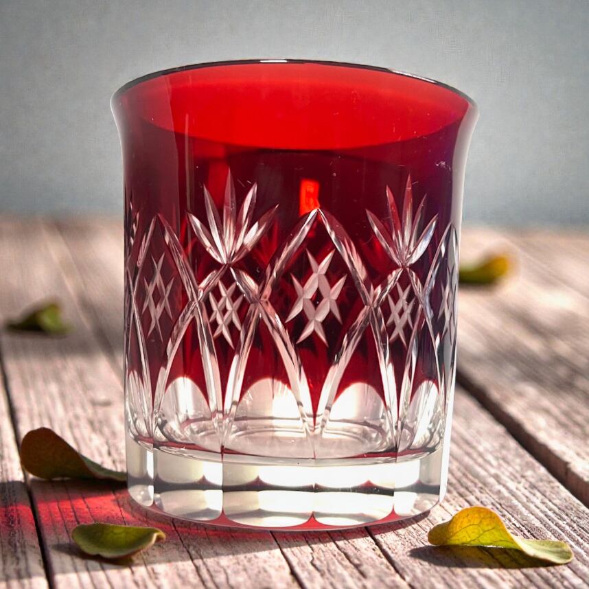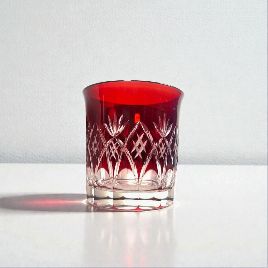 透明ガラスに紅の色ガラスを重ね、丁寧にカットを施した色被せ切子。