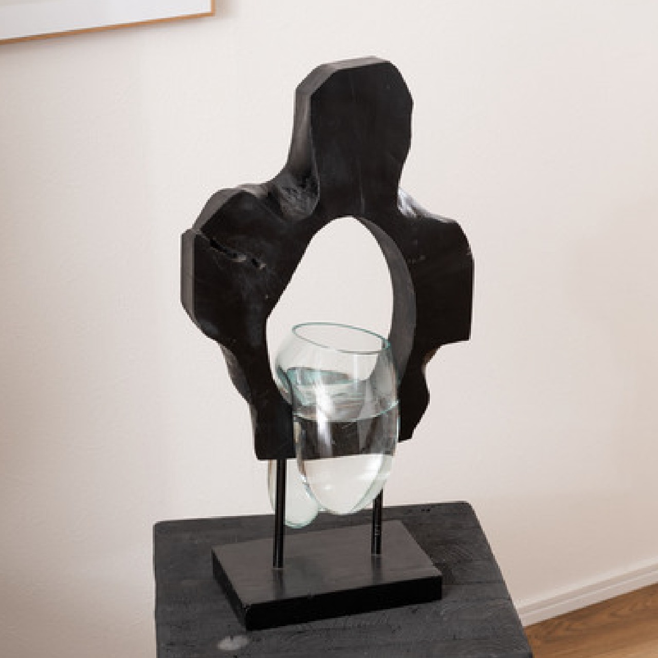 天然木チークの中に溶けたガラスの器が輝くインテリアアート。