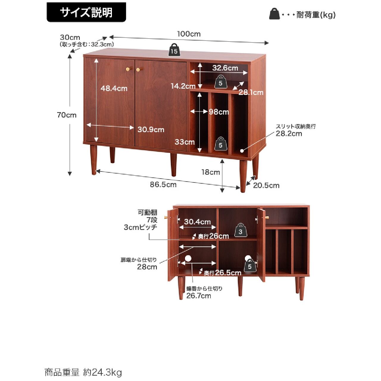 【耐荷重】天板:約15kg 、可動棚板:各約3kg、底板:各約5kg、オープン収納:約5kg、スリット収納:各約5kg