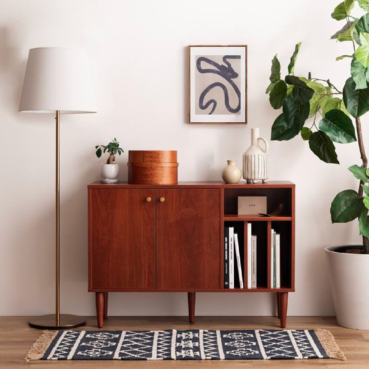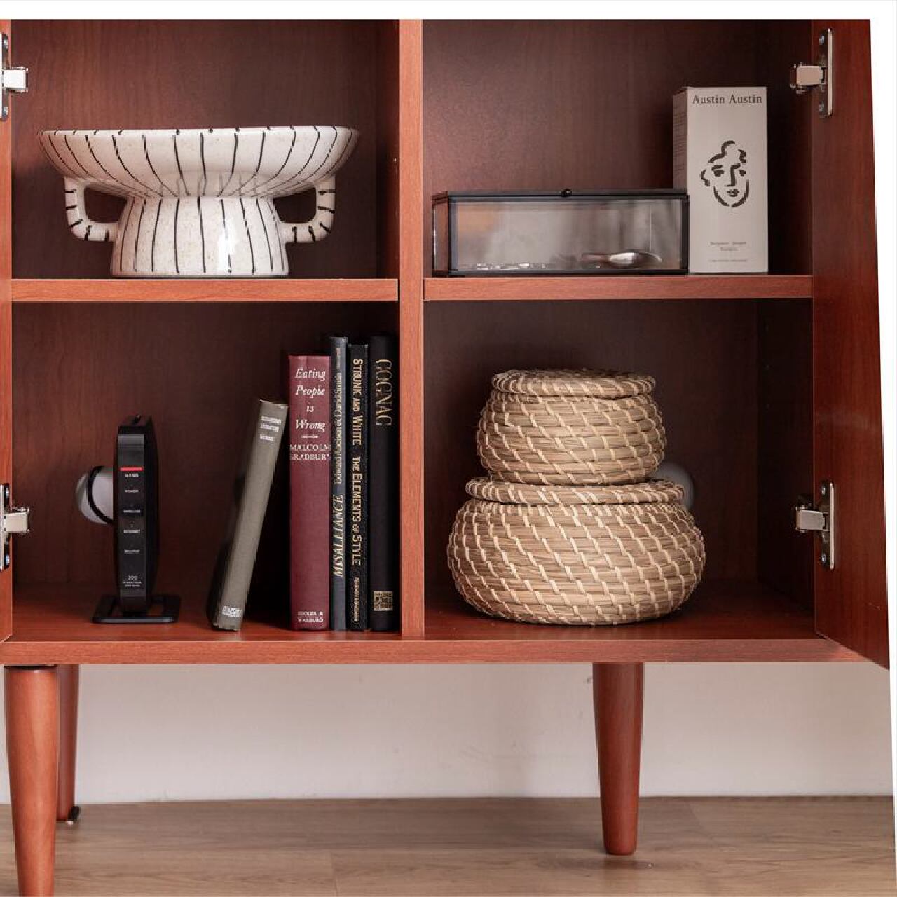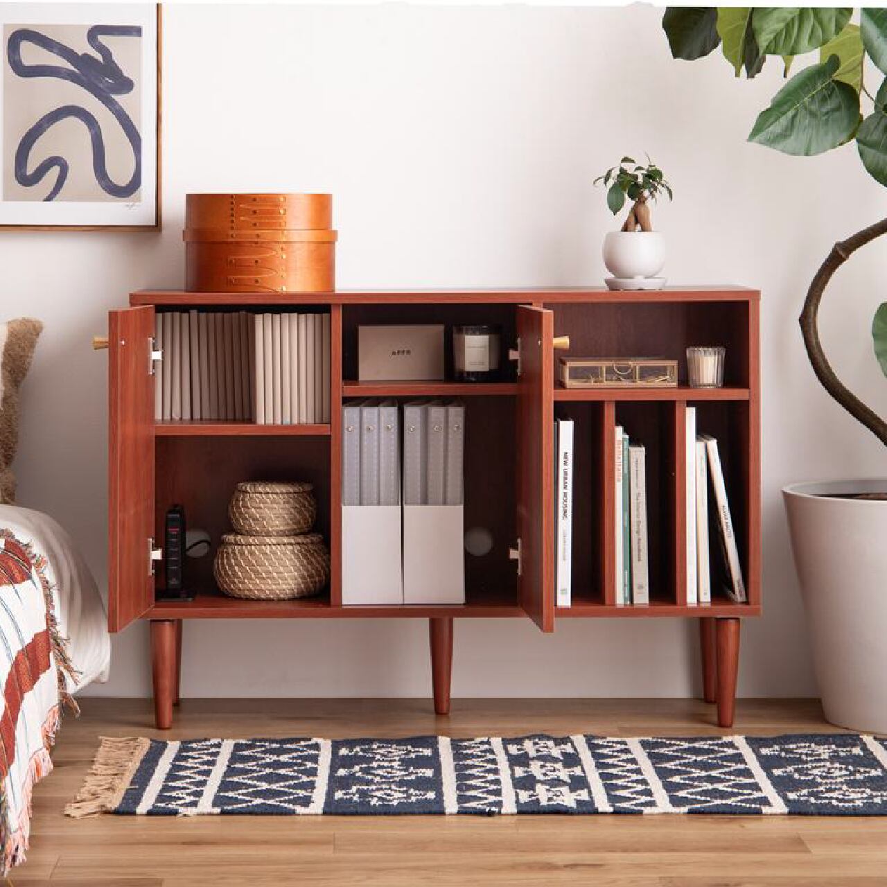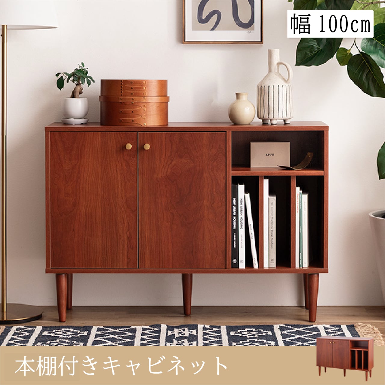 本棚付きで整理整頓しやすい幅100cmの北欧スタイルキャビネットです。