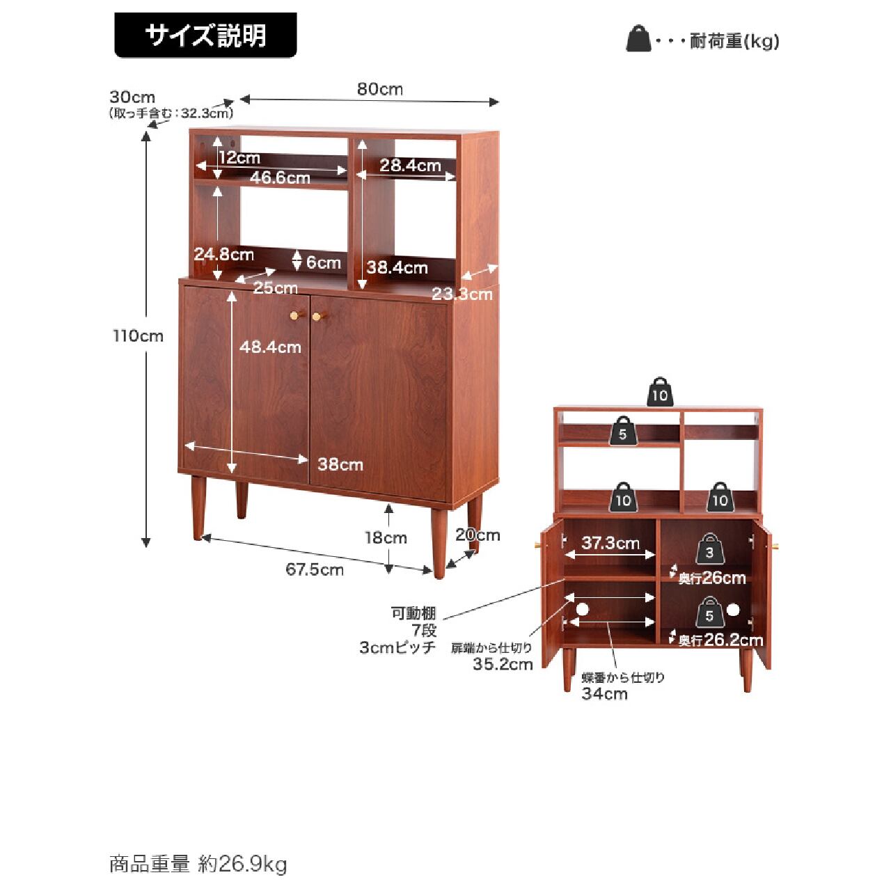 【耐荷重】天板:約10kg、オープン収納(棚):約5kg、オープン収納:約10kg、可動棚板:各約3kg、底板:各約5kg