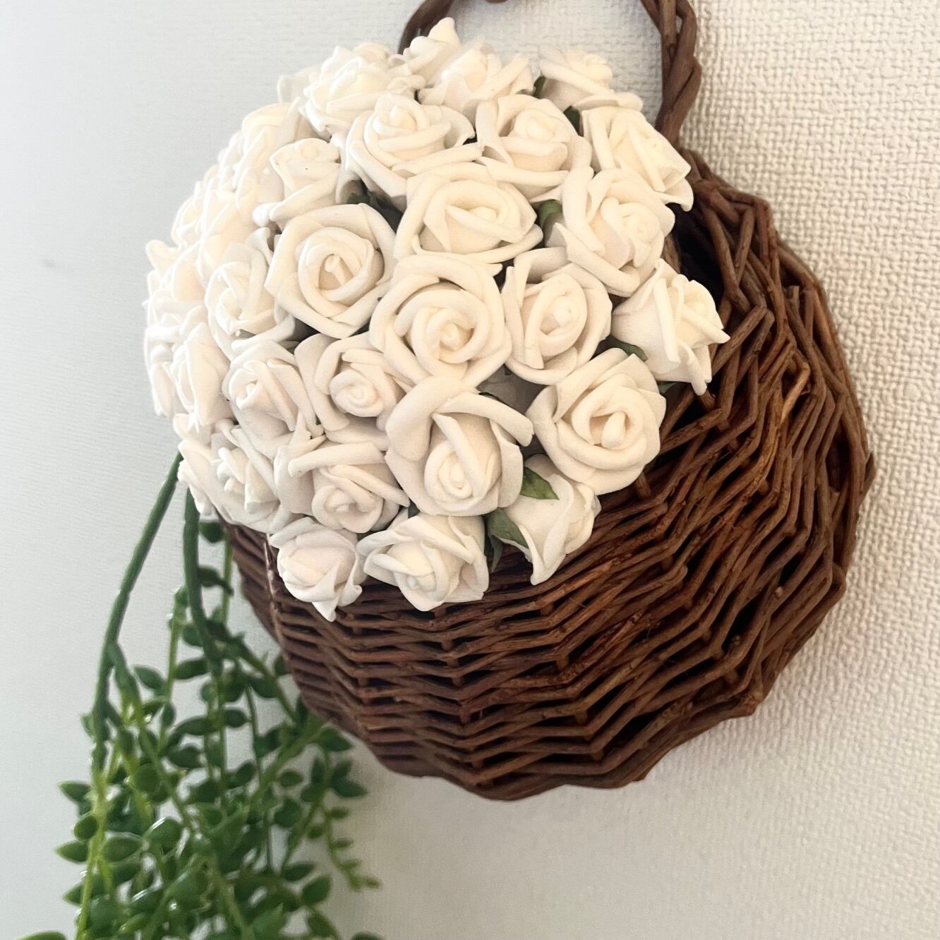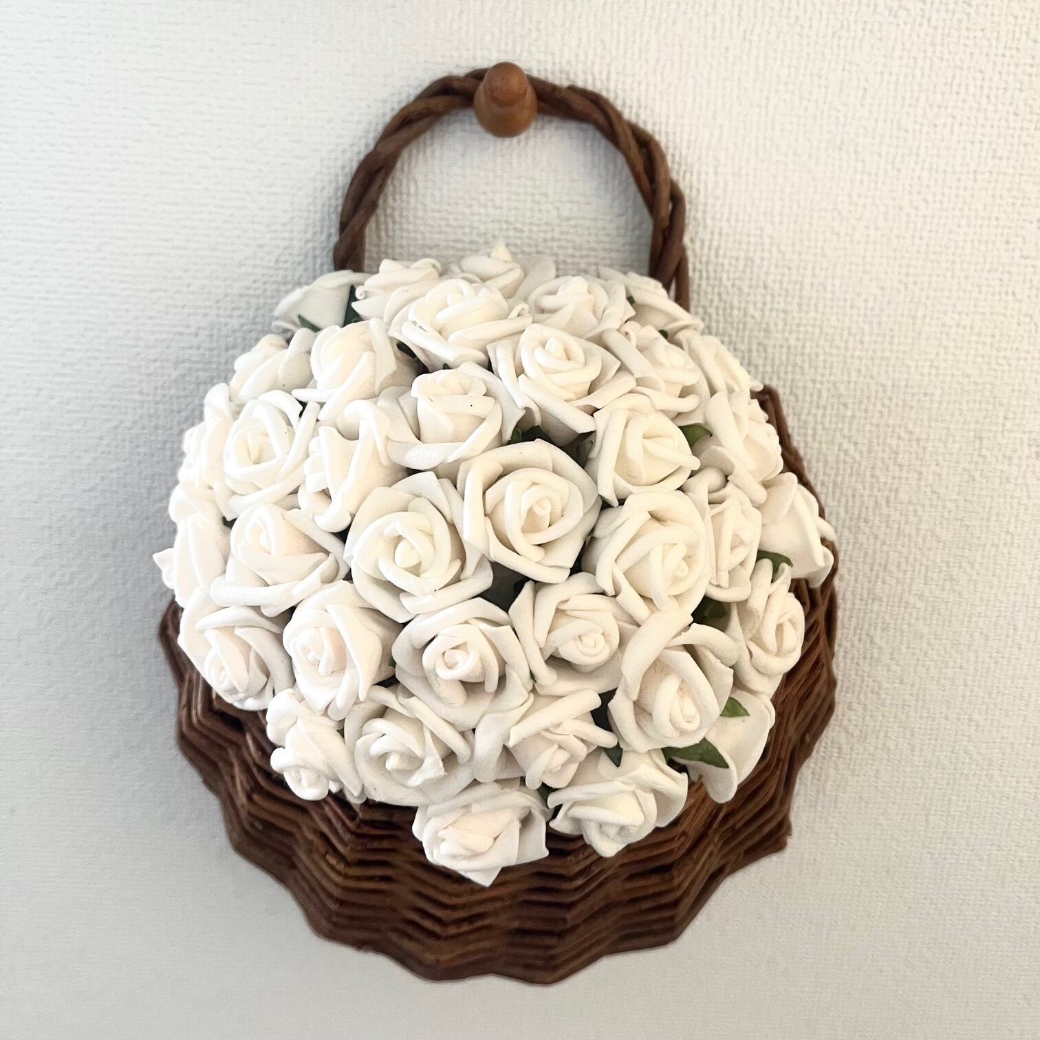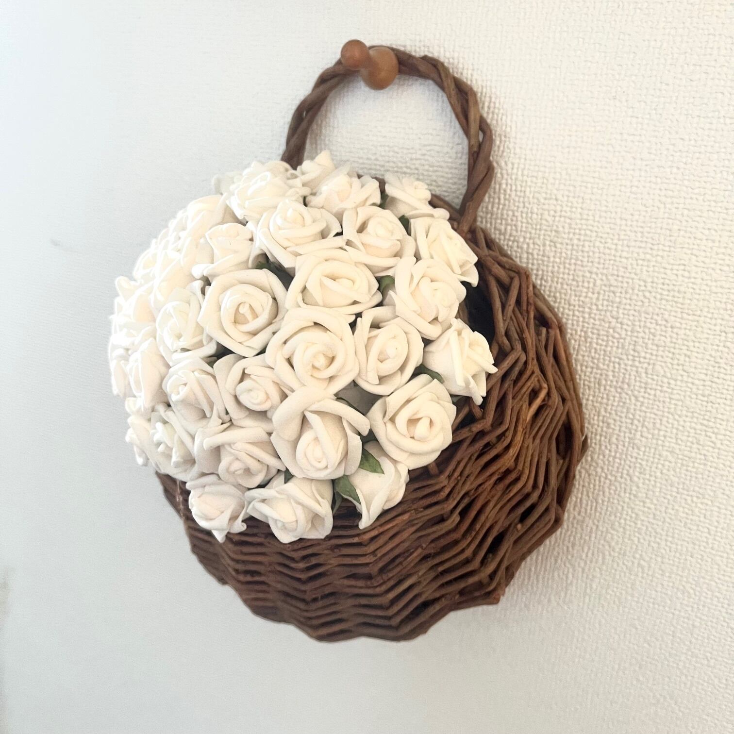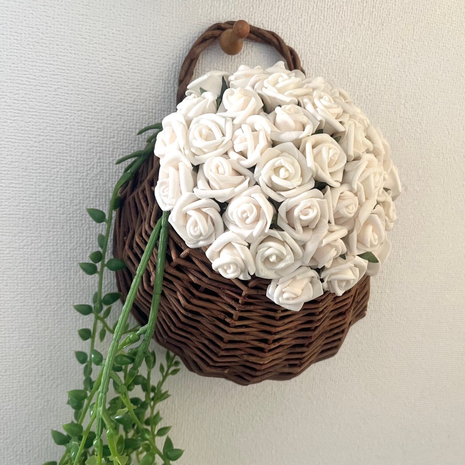 小さな白いバラを無数にあしらった、壁掛けアレンジメントです。