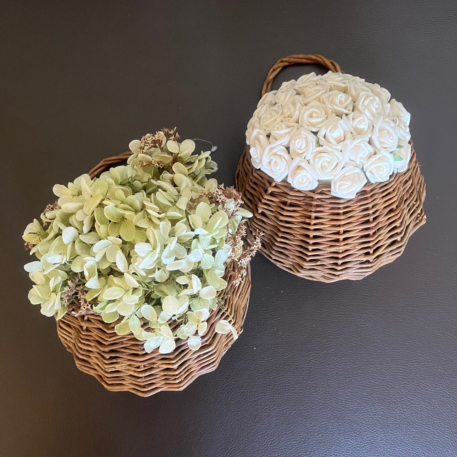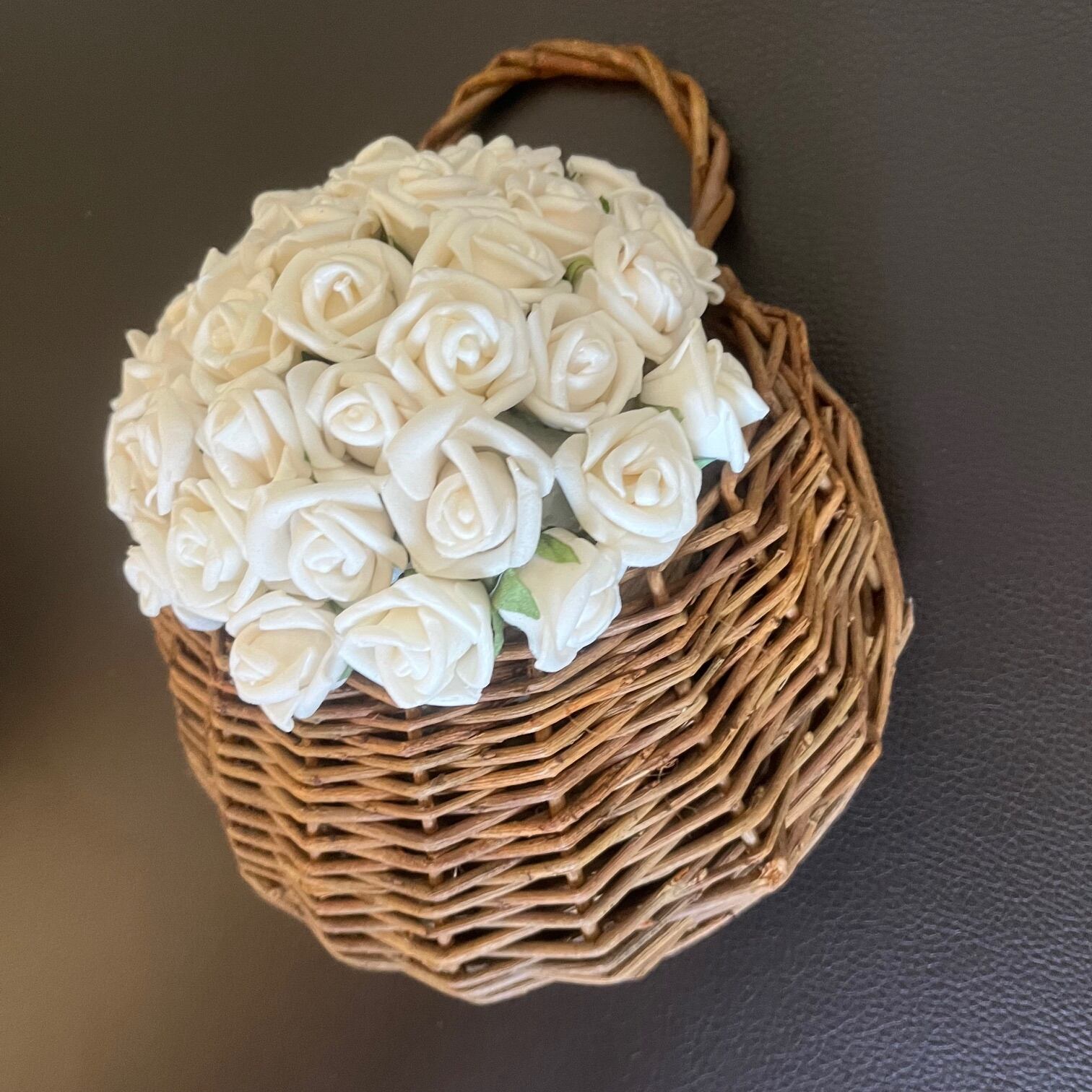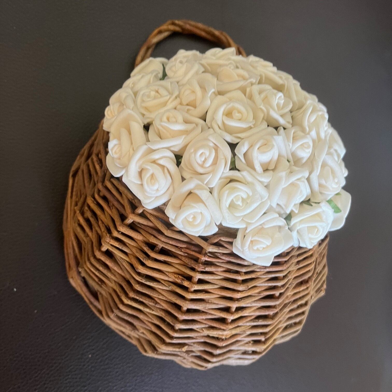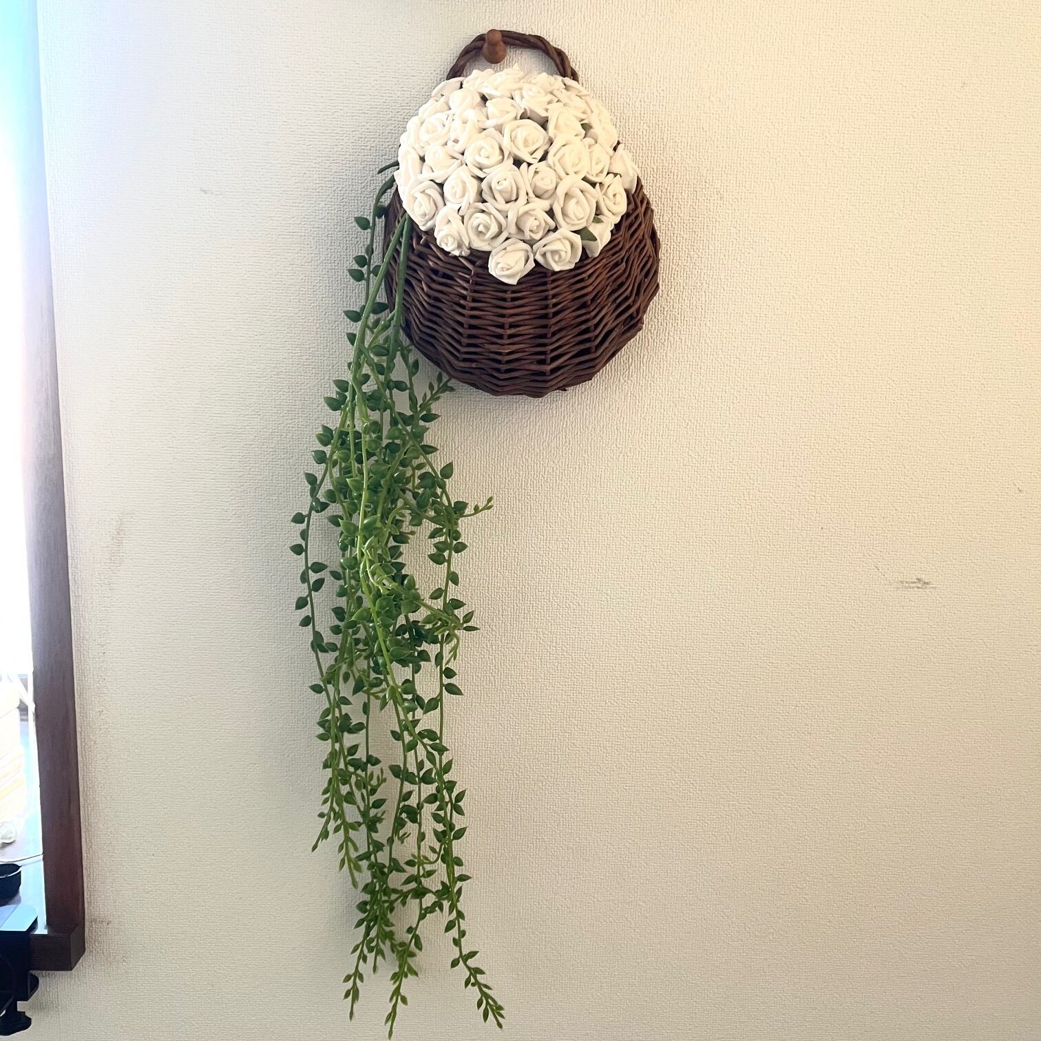 小さな白いバラを無数にあしらった、壁掛けアレンジメントです。