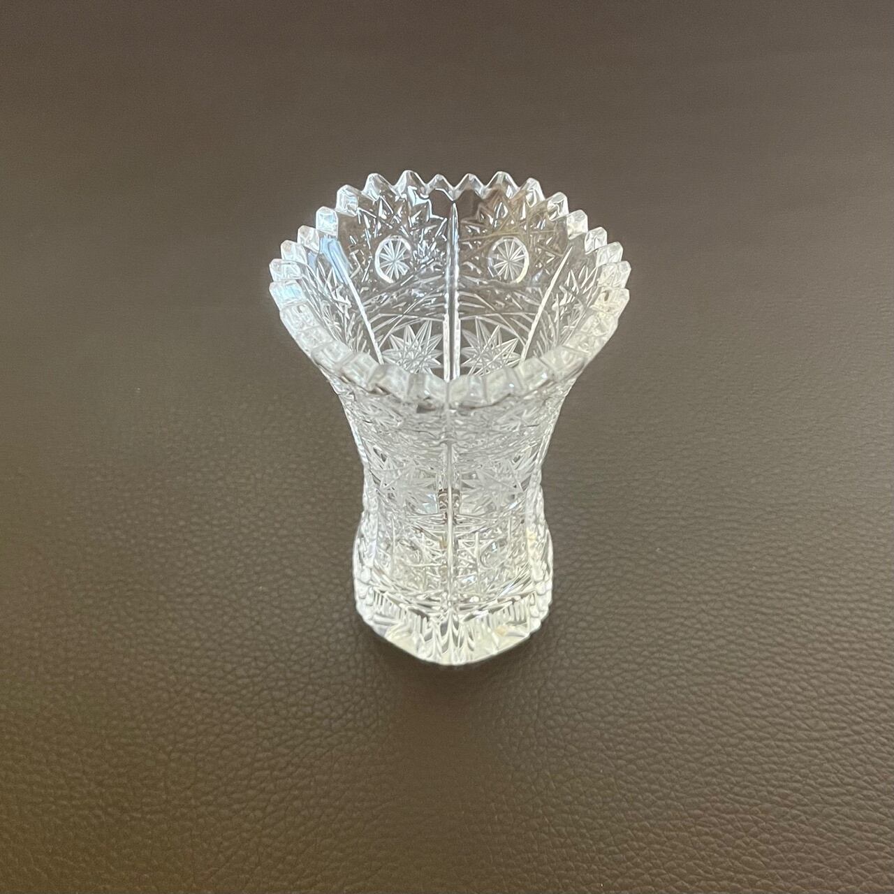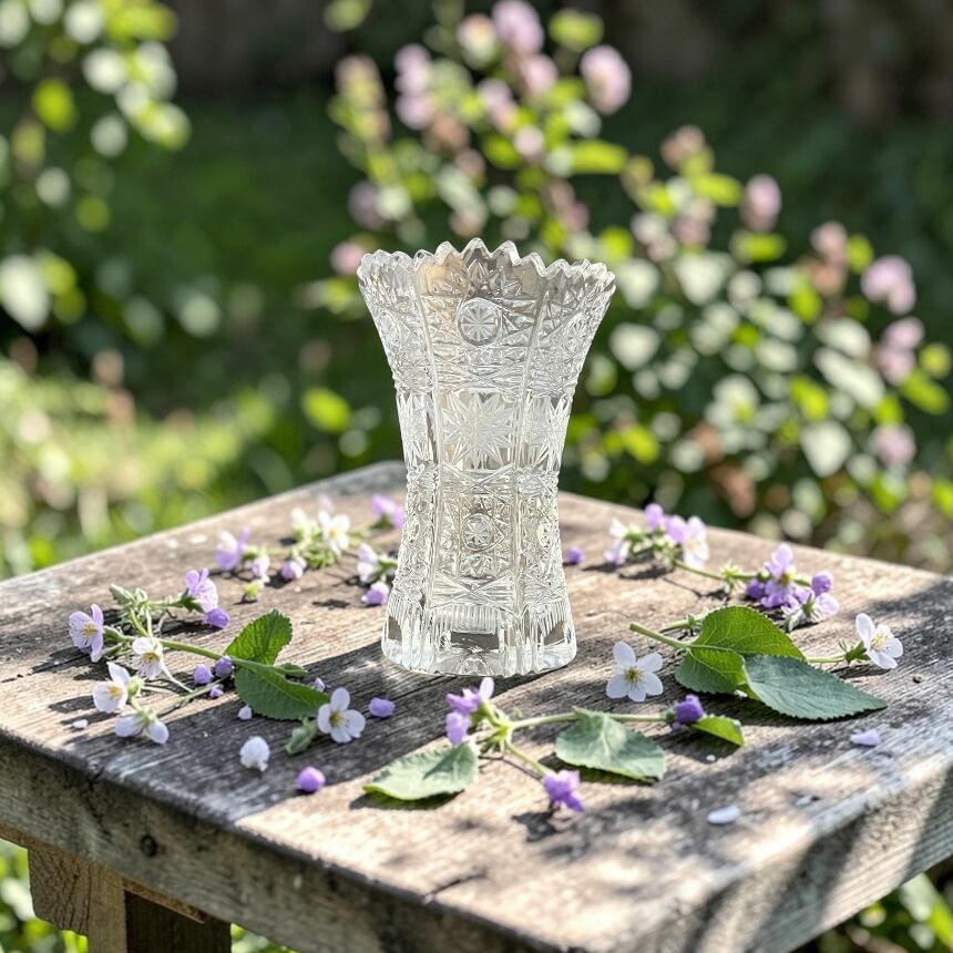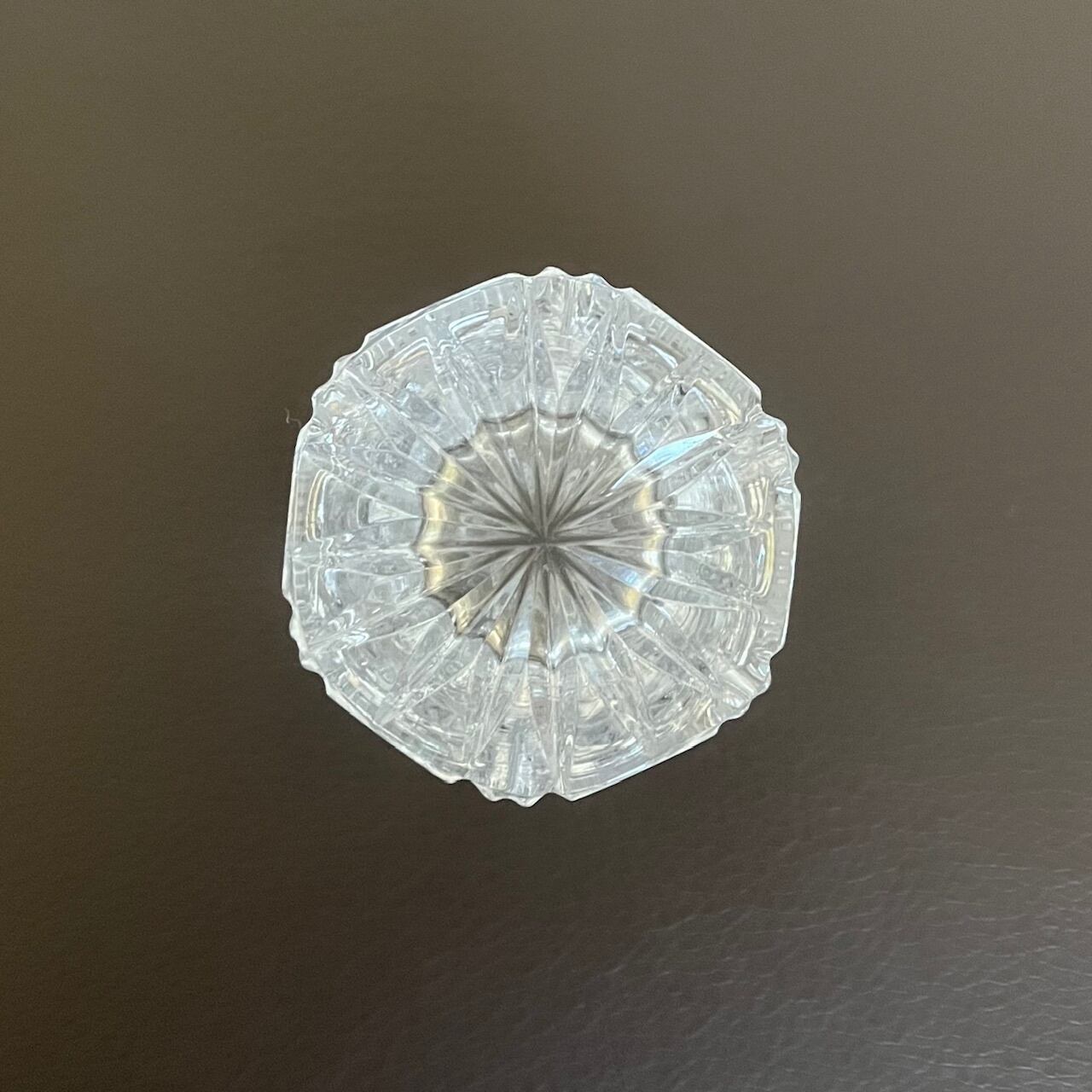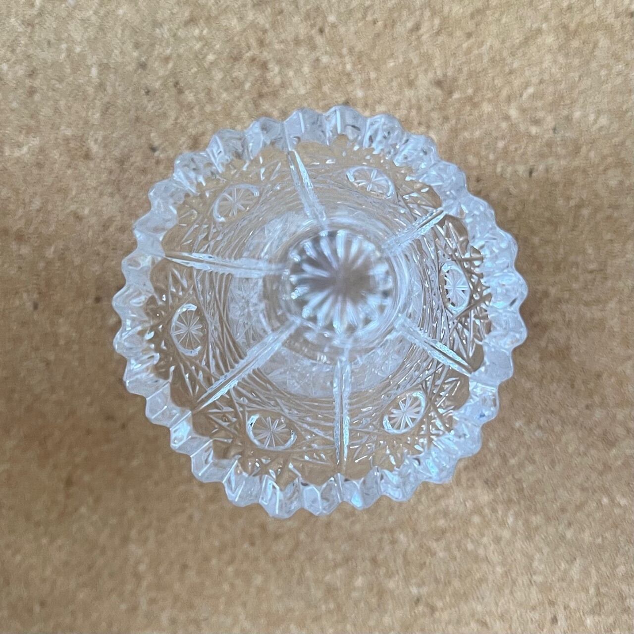 透明のガラス全体に、細やかなカットが施され、縁にかけてギザギザとした装飾が広がる美しいデザイン。