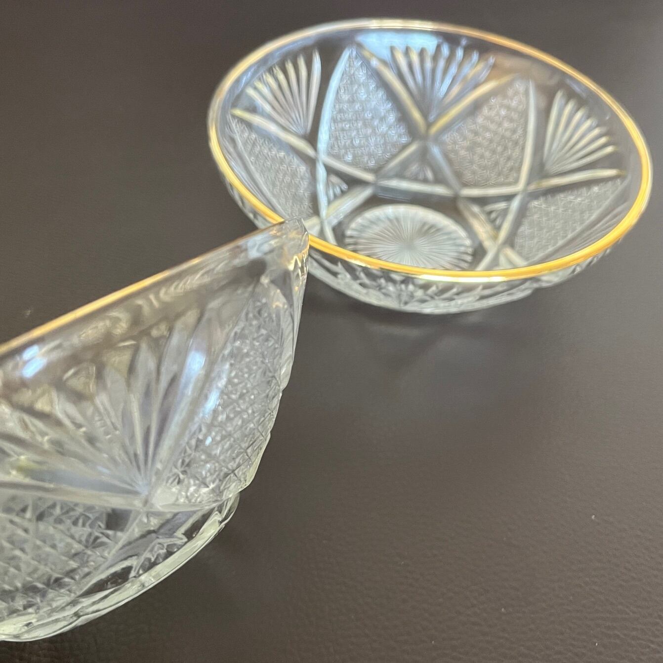 透明ガラスに繊細なカット、縁には金彩が施された気品ある器です。