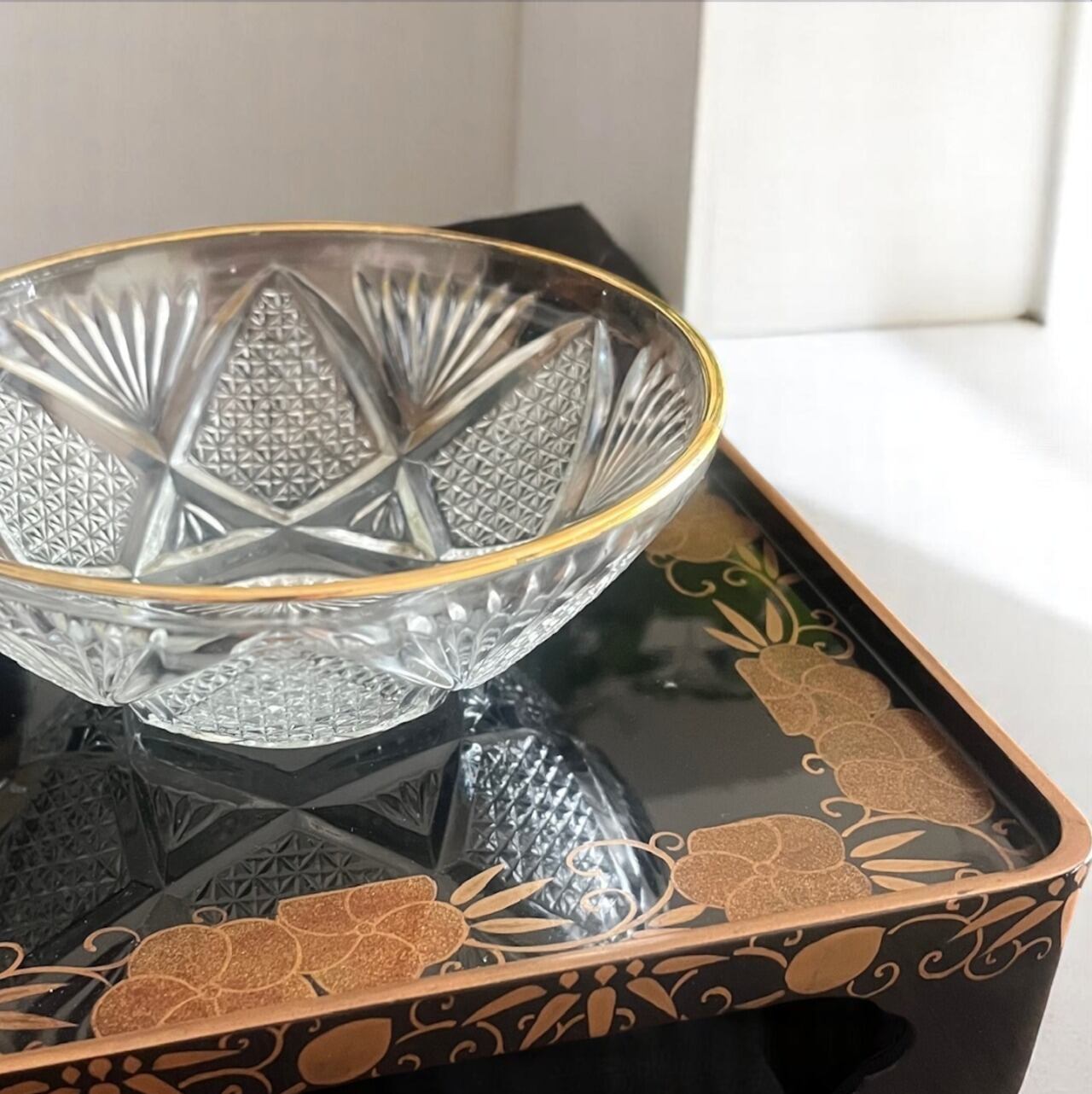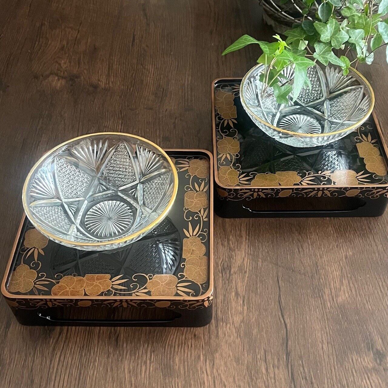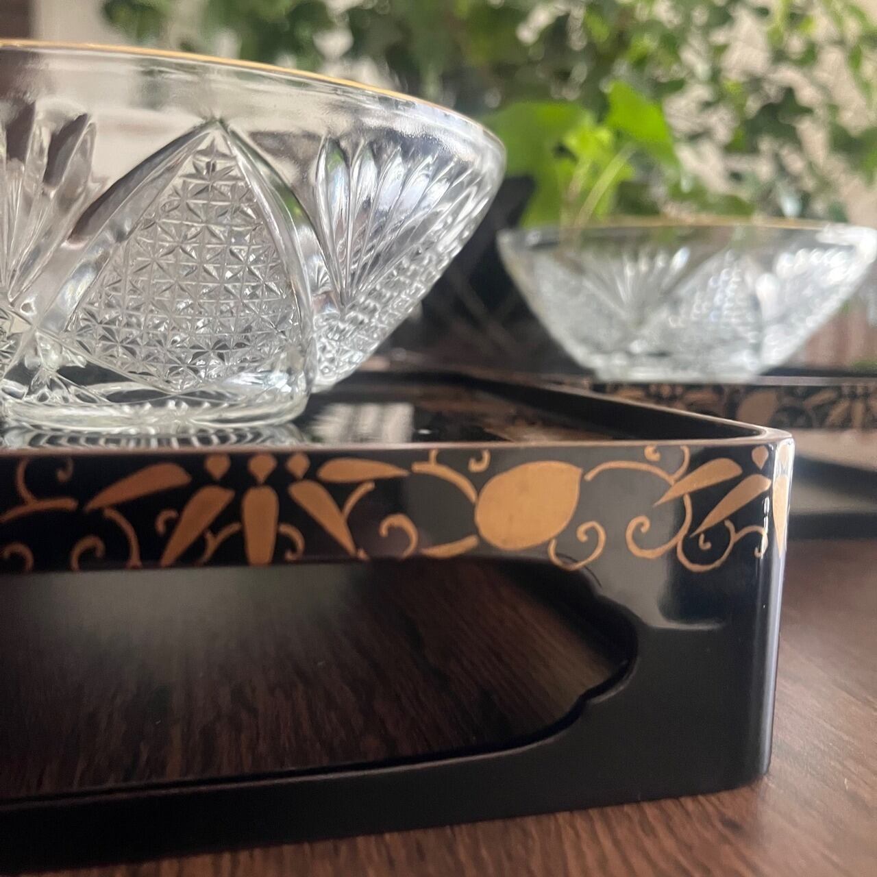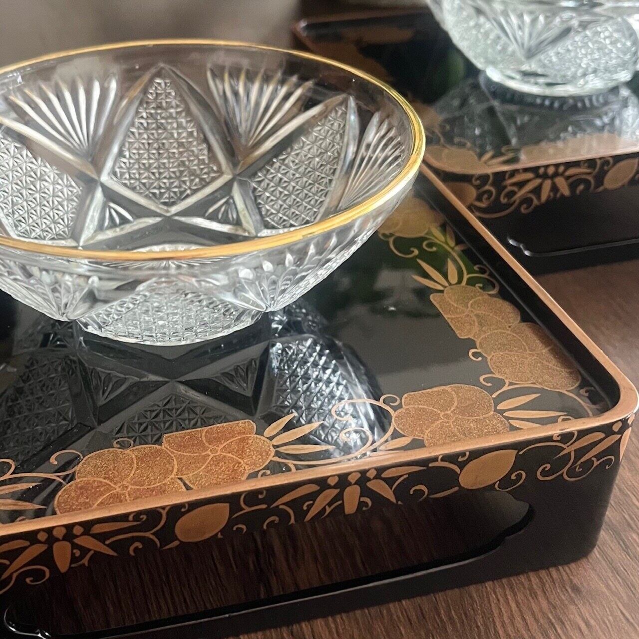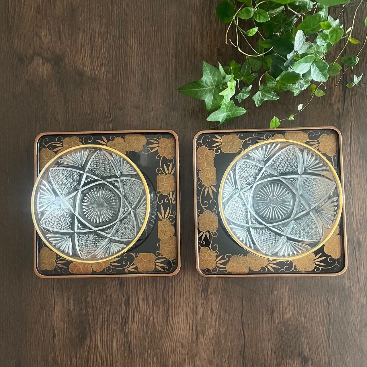 【和と洋の調和】蒔絵金梨地盃洗台&昭和カットガラスボウル 2客ずつセット(計4点)