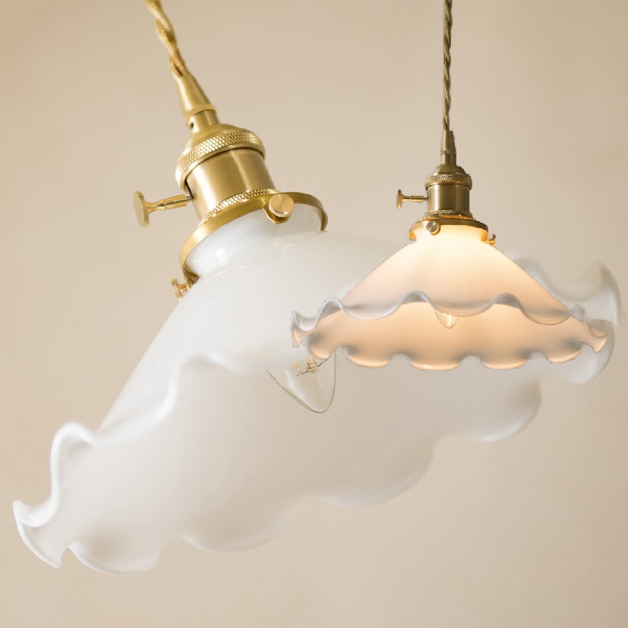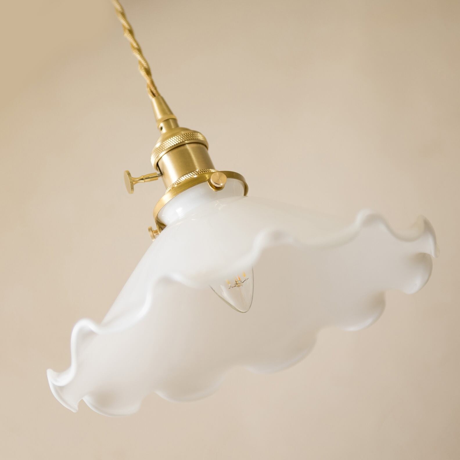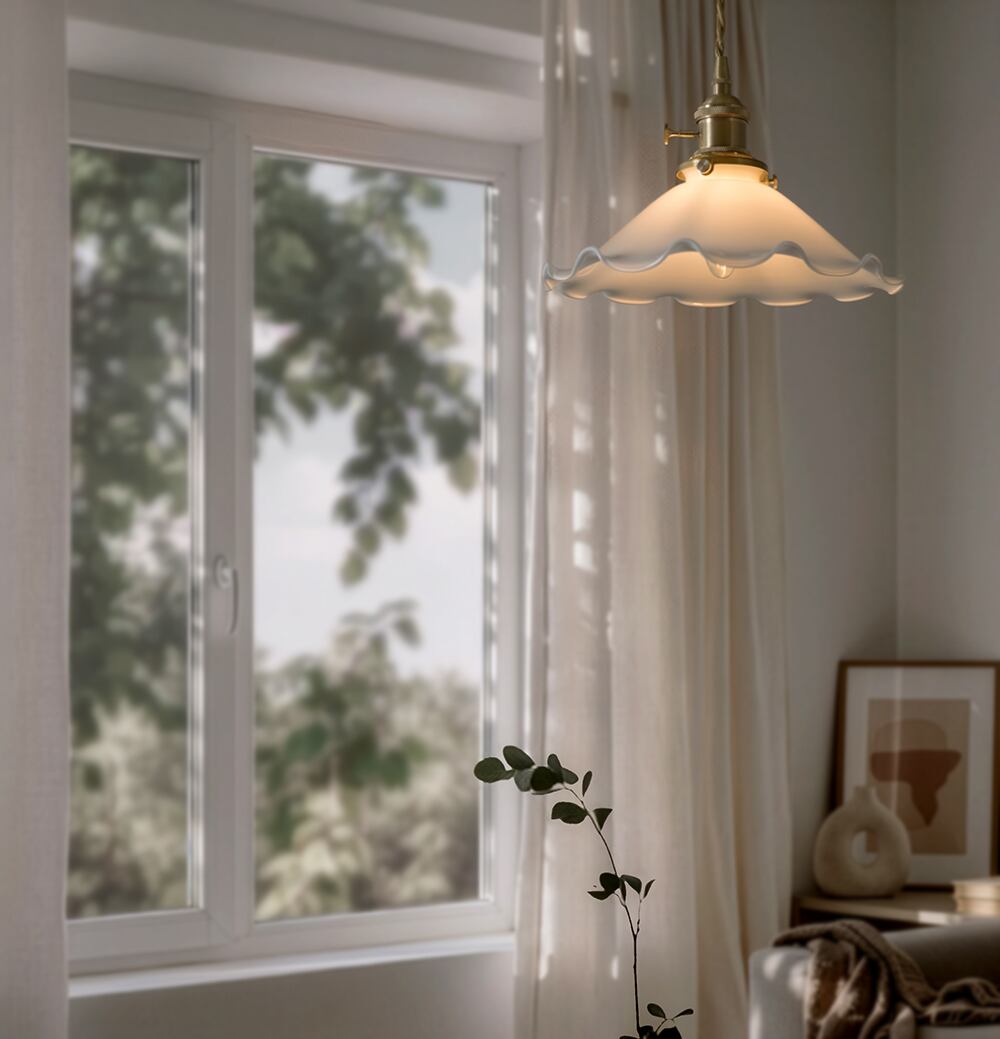 花びらのように広がるミルクガラスシェードが、空間にやさしい存在感を添えるペンダントランプ。