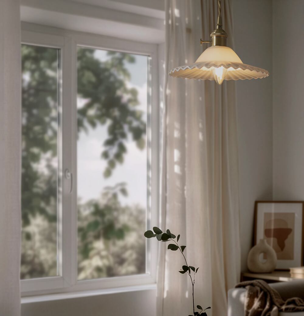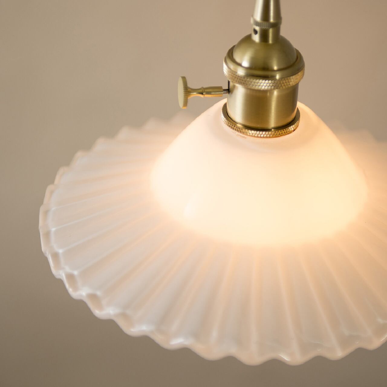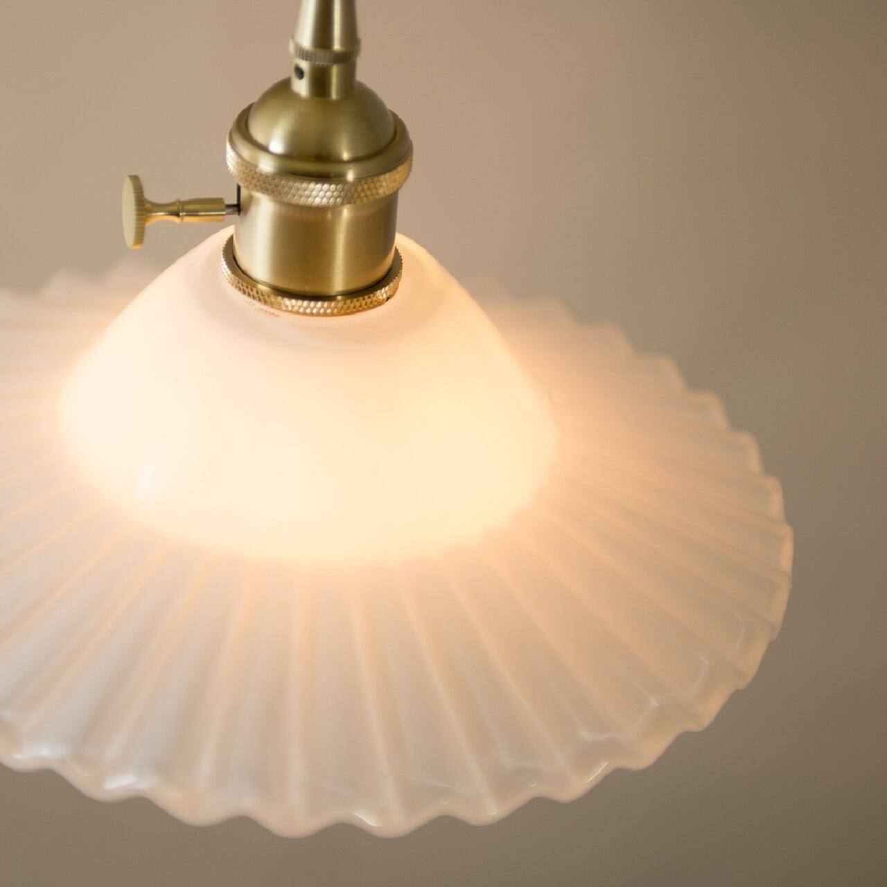 花びらのように広がるミルクガラスシェードが、空間にやさしくなじむペンダントランプ。