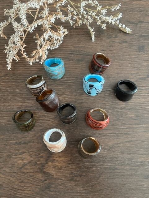 硝子の指輪です。ぽってりと可愛らしく、装いに応じてクールな印象になると好評です。コレクターの間ではスカーフの留具として御使用になられている方も多く、当店の隠れた人気商品です。サイズは凡そ9~11号で制作しております。1点ものですので、こちらは追加発注は不可。贈り物に喜ばれますよ♪
