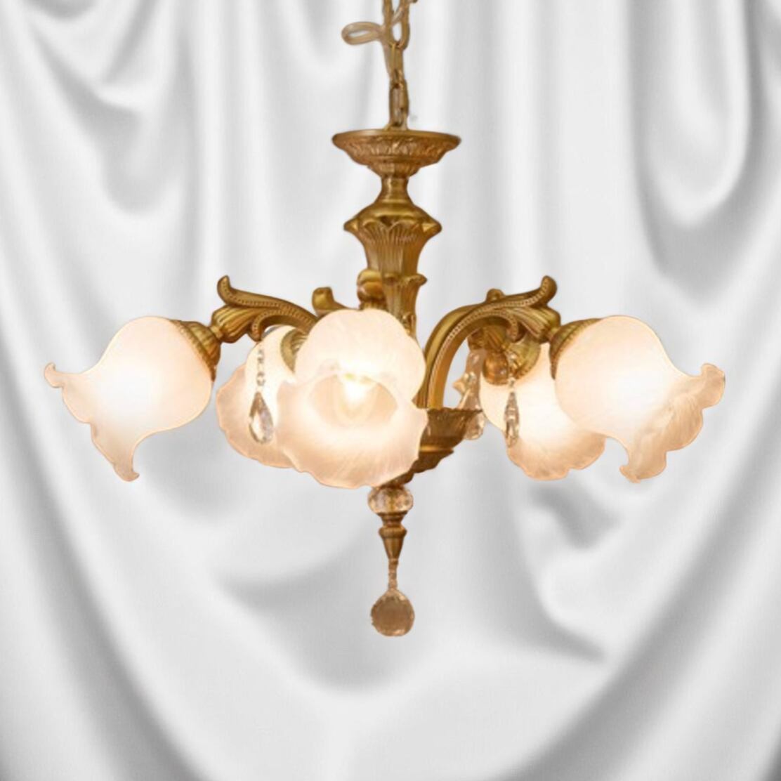 ガラスシェードのデザインにもこだわり、アクセントにゴージャスなクリスタルビーズも付いた上品なクラシカルデザインのシャンデリアです。