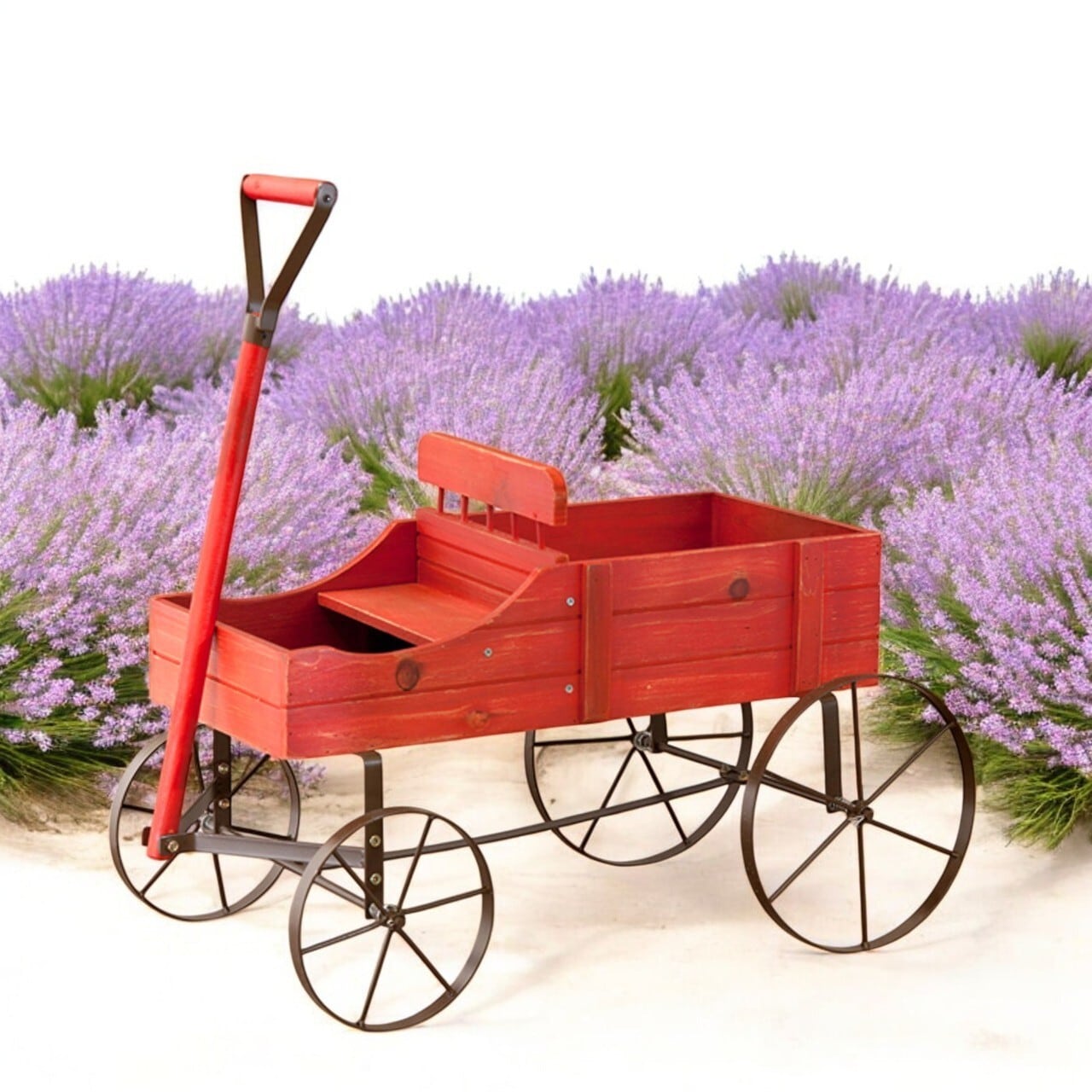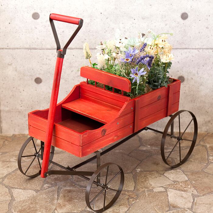 ナチュラルな木の風合いと赤いカラーが目を引く、おしゃれなカート型プランタースタンドです。