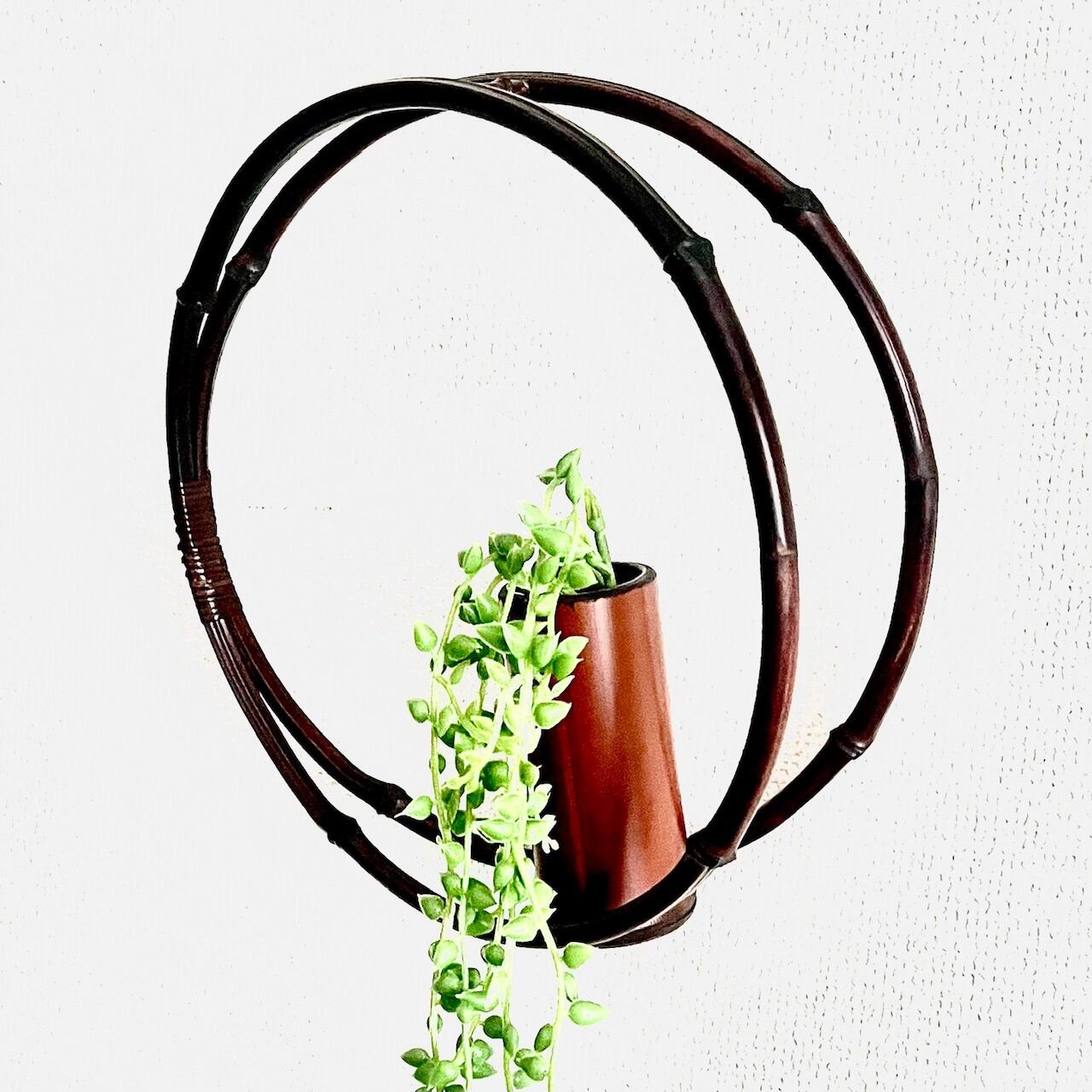 上部に1本丸縁を繋ぐ竹が添えられており、そこに枝物や茎の長いものを立てかけて正面から見て左側に納めたり、逆に右側へ添えますと丸縁の外側に植物が広がるので生け方としても自由度が上がります。