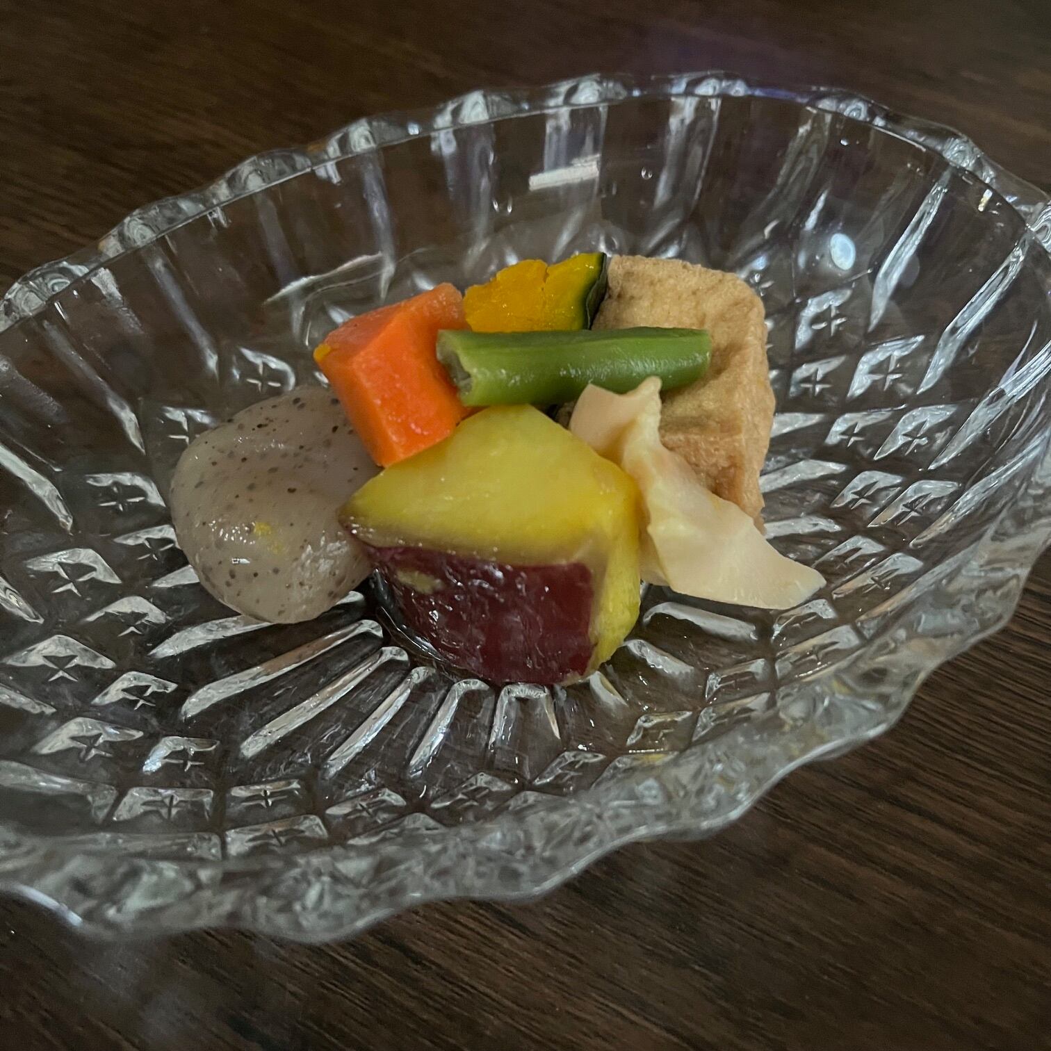 室町時代に作られた唐津の渋い小皿に金継ぎ跡が品良く輝く横に昭和の透明ガラスを対象的に配置して、それぞれに旬の食材を少量添えて、飲み物はお気に入りのグラスで乾杯♪
